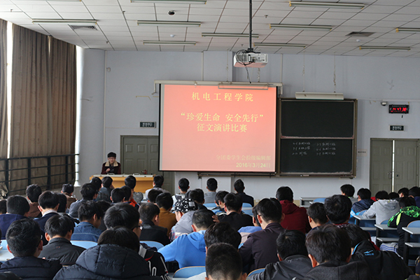 为宣传普及校园安全知识,提高广大师生的安全防范意识,建设平安和谐校园,2016324日,学校在教三楼301举办了主题为珍爱生命,安全先行的征文演讲比赛。此次活动由我校文明办主办,机电工程学院承办,学院2015级同学参加了此次比赛活动。