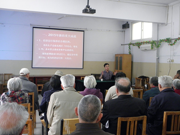 易善武博士首先从2015年的重大成就、2015年所面临的困难和问题、2016年的预期目标和2016年的重点工作四个方面对2016年两会精神作了高度概括。结合具体事例和河南的实际,对政府工作报告和国民经济和社会发展第十三个五年规划等两会精神进行了详细解读,特别对涉及教育、养老、就业等老同志关注的热点问题作了重点说明。报告会内容丰富详实,语言通俗易懂,讲解深入浅出,对老同志们进一步深入学习和宣传两会精神大有裨益。