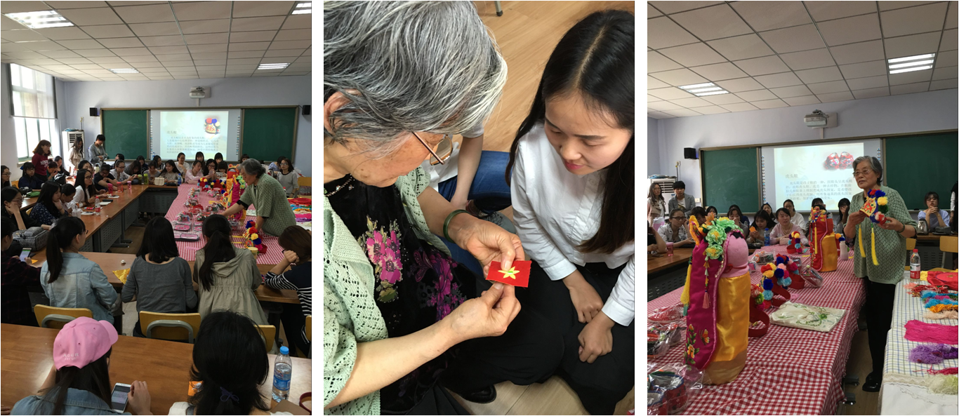 还记得儿时的虎头鞋、虎头帽吗?2016年4月21日下午,民艺美育坊之中国传统女红艺术活动如期进行,艺术设计学院再次邀请河南省民间艺人、78岁的余金荣老人为师生讲述虎头鞋,虎头帽等传统女红的制作过程以及特殊含义。此次活动由我校文明办主办,学院承办。学院党总支副书记张莉老师及部分教师和本硕学生共计五十余人参与了活动。