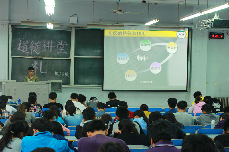 为了弘扬我国优秀传统文化,积极践行社会主义核心价值观,切实提高大学生思想道德素质,学校于4281430分在东一楼218教室成功举办了以“明礼厚德,做一个有礼有节的人”为主题的“道德讲堂”活动。此次活动由学校文明办主办,数学与信息科学学院承办。