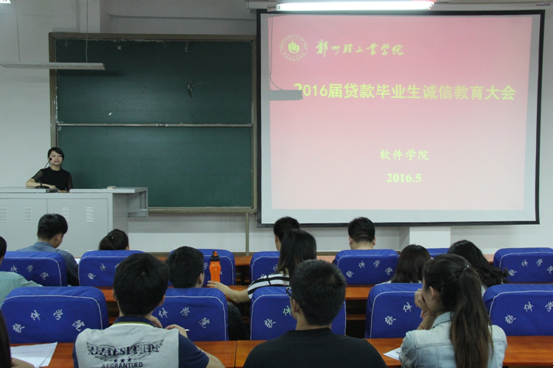 为进一步加强贷款毕业生的诚信意识,做好学院2016届毕业生贷款工作,5月12日下午,软件学院积极响应学校学工部、文明办号召,在软件楼219教室召开“2016届贷款毕业生诚信教育大会”,学院负责贷款工作的老师和毕业班辅导员以及2016届贷款毕业生参加了大会。