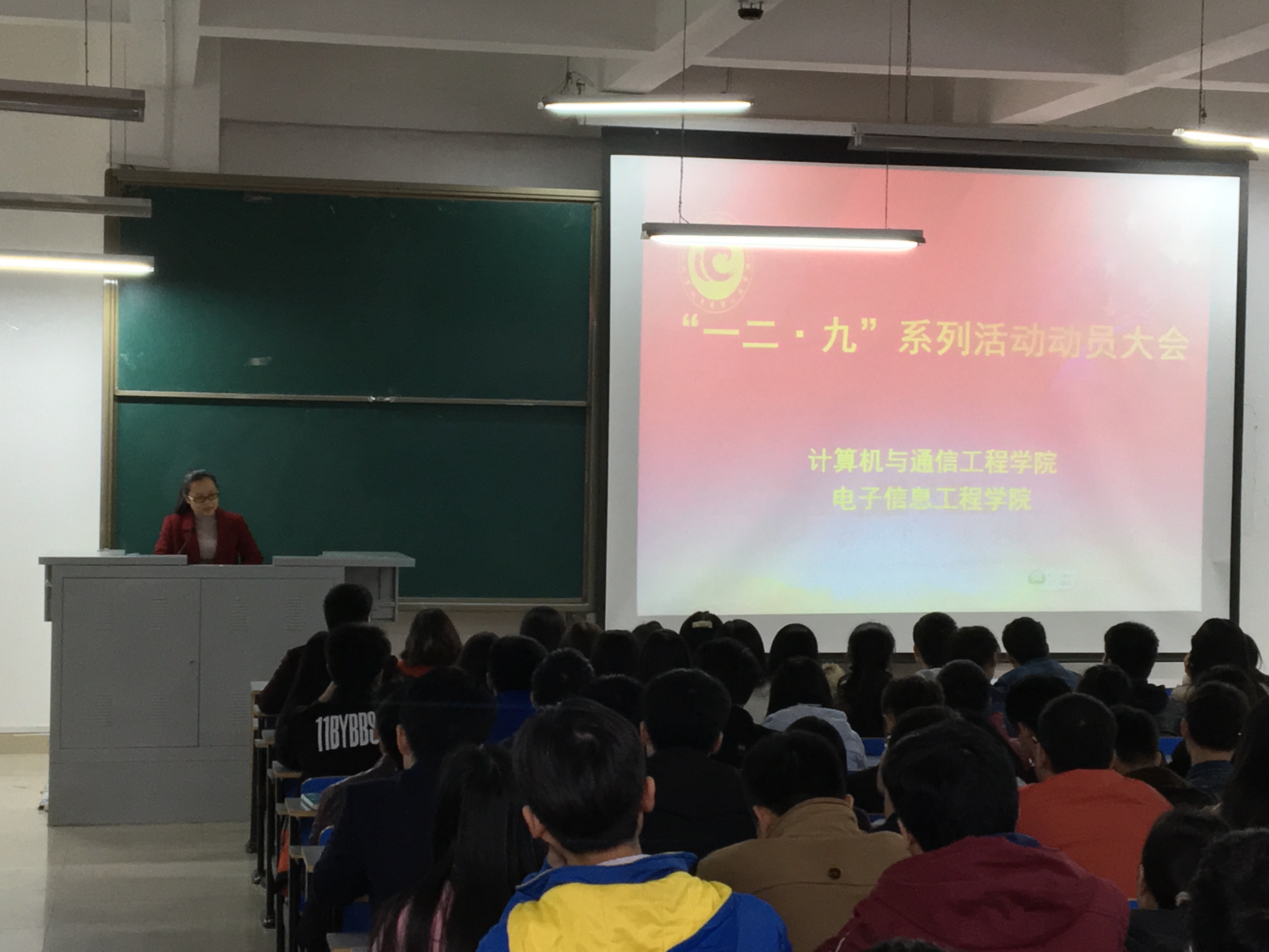 为纪念“12·9”运动81周年,展现当代大学生的爱国情怀,11月15日中午12:00,计算机与通信工程学院(电子信息工程学院)积极响应学校文明办、校团委号召,在计算机楼118召开纪念“12·9”运动81周年系列活动动员会。学院分团委书记沈高峰老师、学工办主任司丽娜老师、专兼职辅导员、各班班长、团支书、学习委员、学生代表近300人参加了会议。