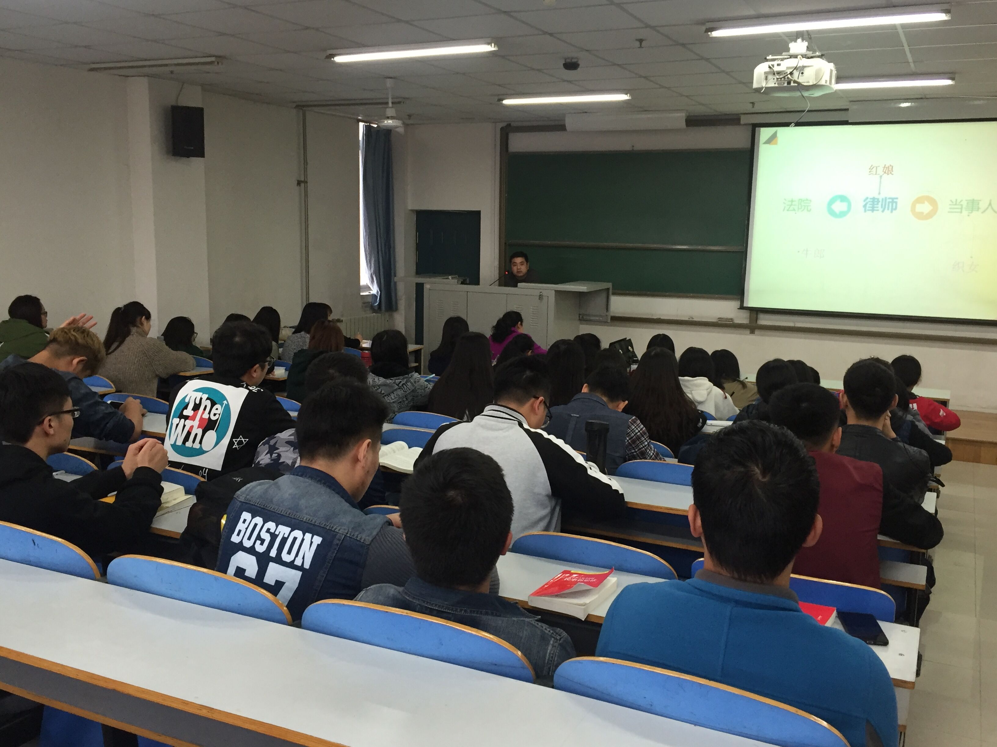 2016年11月14日,学校邀请河南天欣律师事务所主任、书记马斌律师在一教楼413进行了以“牛郎织女——律师是否是红娘”为主题的民事诉讼讲座。此次活动由我校文明办主办,政法学院承办。法学系王阁老师,以及法学专业15级全体同学参加了此次讲座。