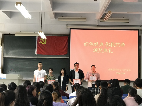 为传承红色经典,丰富专业课文化知识,外国语学院学生党支部于5月24日下午三点在教三楼107举行“红色经典你我共译”翻译比赛颁奖仪式。学生党支部书记矫菲老师、部分学生党员、入党积极分子参加仪颁奖仪式。