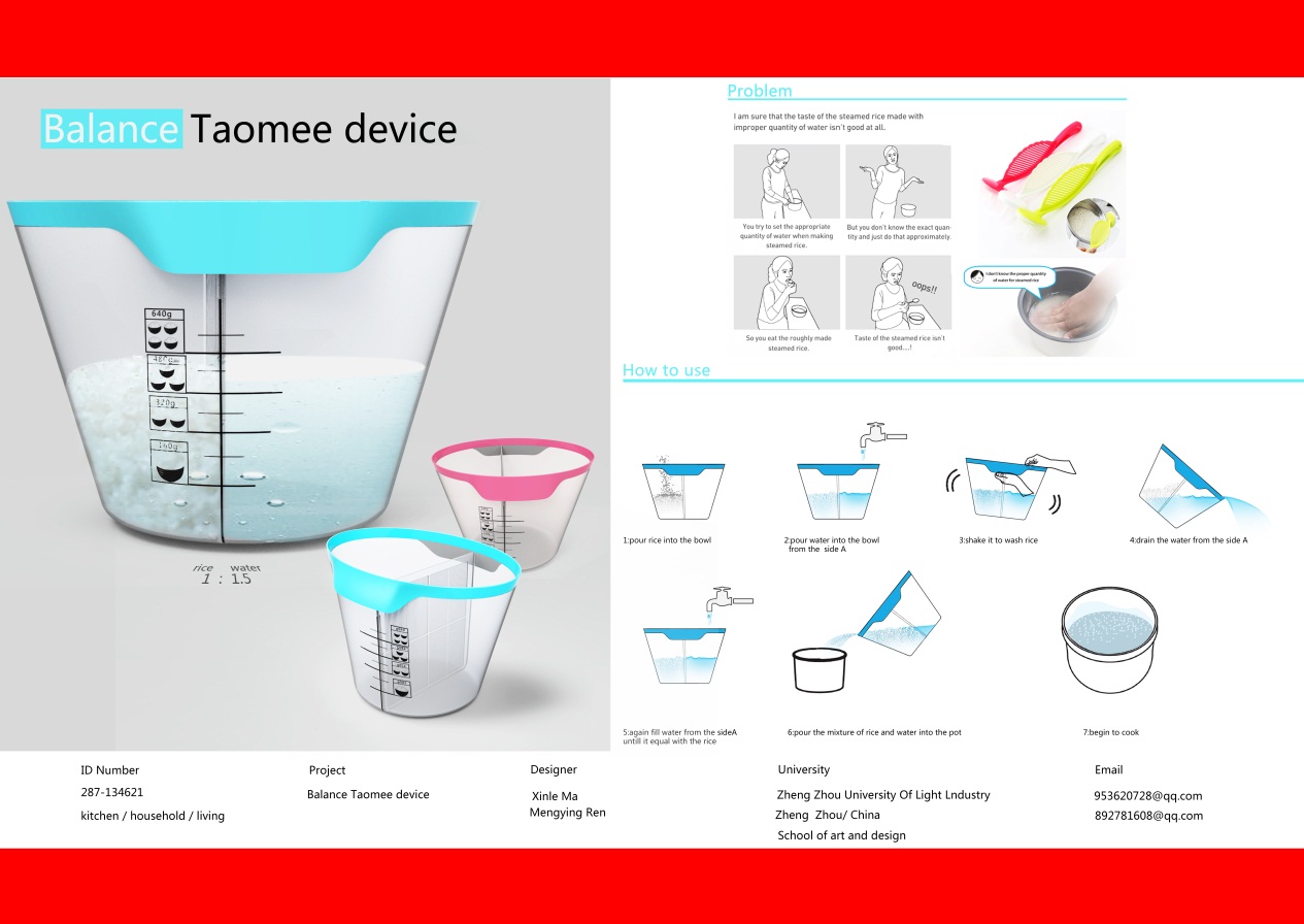 《Balance Taomee device》作品介绍:我们在做米饭的时候经常遇到以下问题:一是在淘米的时候在倒淘米水的同时容易把洗干净的米也倒掉造成浪费,二是做米饭的时候掌握不住米和水混合的比例,影响米饭的品质。这个碗状淘米器的中间位置有一个镂空隔层,能够过滤大米不随水一起倒掉,在碗壁上印有刻度,能够标示恰当的米和水的比例,使做米饭更便捷。