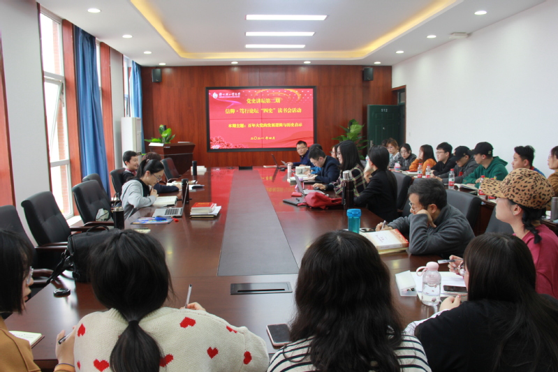 为深入贯彻习近平总书记在中共中央关于开展党史学习教育动员大会上的重要讲话精神,按照学校党委对党史学习教育的安排部署,马克思主义学院精心筹备,于4月23日举办了党史讲坛暨信仰·笃行论坛“四史”读书会活动。马克思主义学院院长闻英、副院长黄天弘和教师代表出席活动,2019级和2020级全体硕士研究生参与学习。