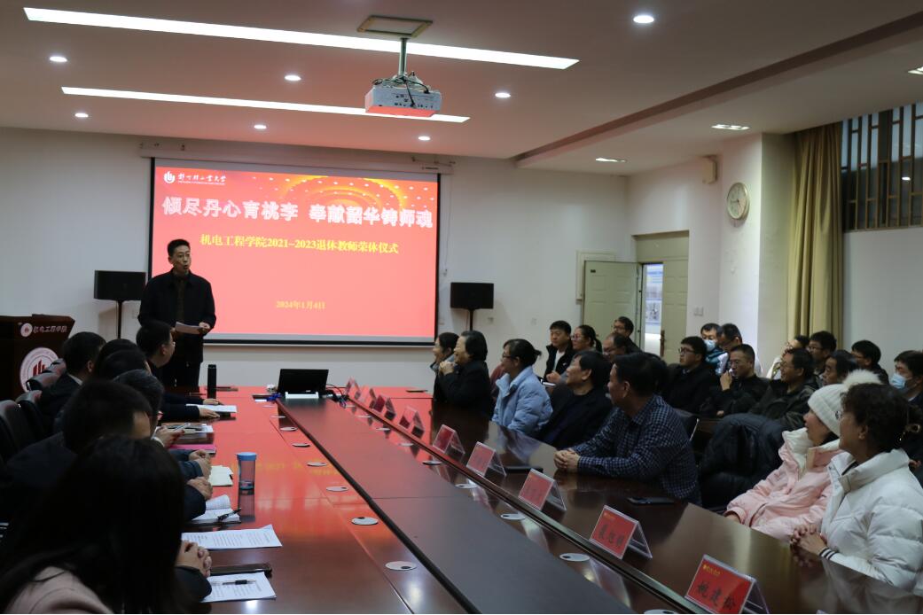 2024年1月4日下午,机电工程学院在东风校区西三楼215会议室举办2021-2023年退休教师荣休仪式,12位退休教师、学院全体教职工、学生代表参加会议。党委书记刘国豪主持会议。