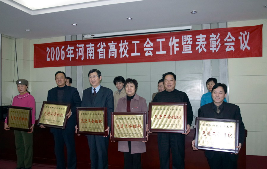 在2006年河南省高校工会工作暨表彰会议上,我校工会被中国教科文卫体工会全国委员会授予“全国教科文卫体系统先进工会组织”的荣誉称号,成为河南省获此荣誉的六所高校之一。河南省总工会副主席王春萍、中国教科文卫体工会委员会常委、河南省教科文卫体工会主席李新江等领导同志为我校工会颁发了奖牌。 此外,我校工会还荣获2005年河南省教育工会表彰的“女工工作先进单位”;省教科文卫体工会、省教育工会表彰的“为职工办实事”优秀组织单位及“职业道德教育年”优秀组织单位的殊荣。