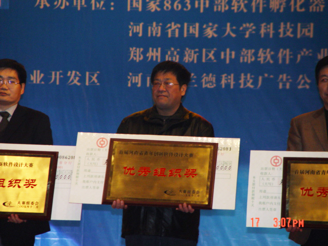 由河南省科技厅、河南省教育厅、共青团河南省委、郑州国家高新技术产业开发区联合主办的首届河南省青年创新软件设计大赛,于2005年12月17日在郑州市艺术宫隆重举行颁奖典礼。经大赛组委会数轮的评选,本届大赛申报作品330件,共评出银奖两名,优胜奖10名、优秀奖55名。我校计算机与通信工程学院选送的五件作品获优胜奖一项,获优秀奖二项。学校还获得优秀组织奖。