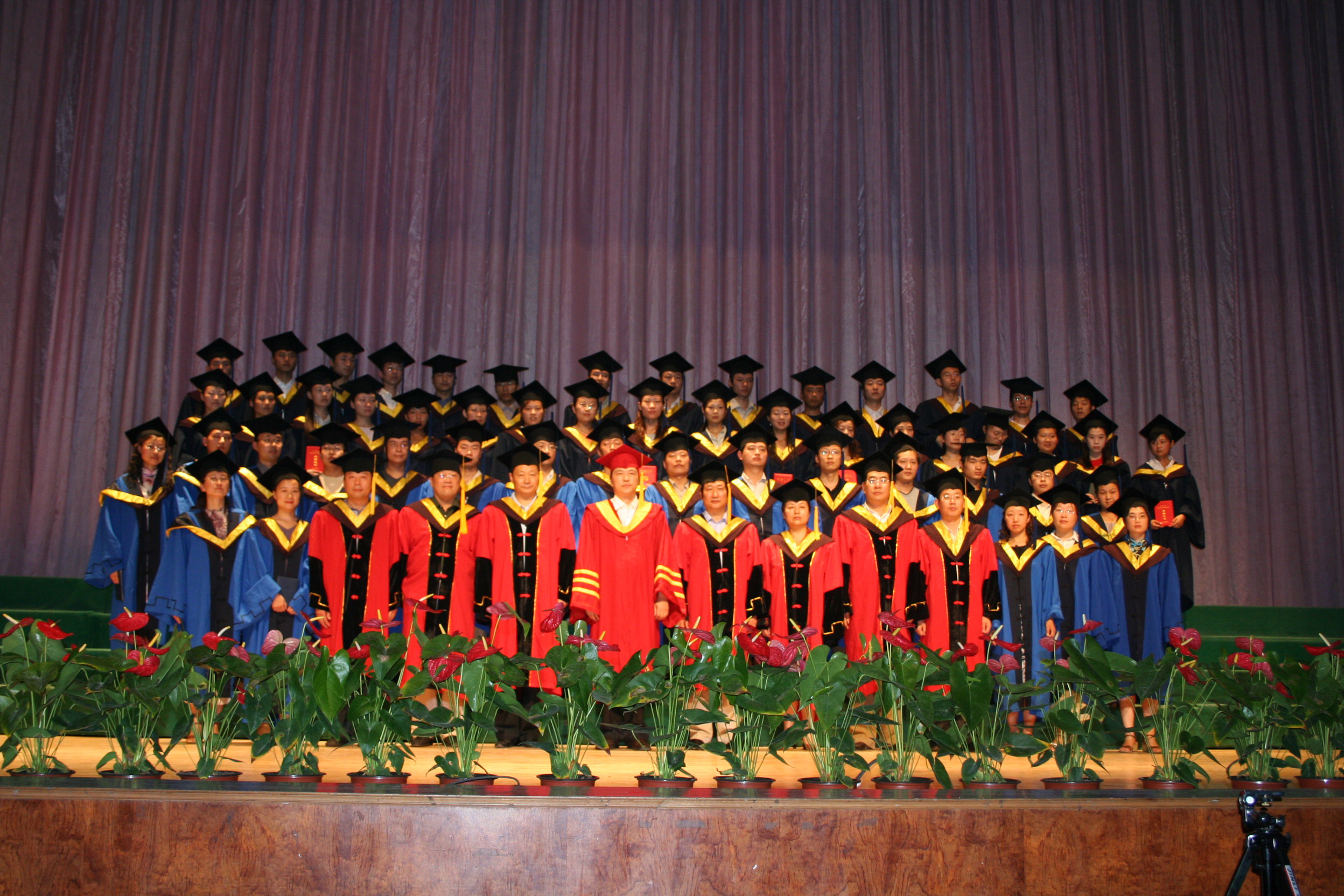 毕业典礼在雄壮的国歌声中开始,副校长吴铁军教授首先宣读了“关于表彰2005届优秀毕业生及‘十佳毕业生’的决定”;校学位评定委员会副主任、副校长张鑫教授宣读了“关于授予刘允等2448名本科毕业生学士学位的决定”和“关于授予聂晶等110名成人本科毕业生学士学位的决定”;学校领导为获得学士学位的毕业生代表颁发了学位证书;校学位评定委员会副主任、副校长龚毅教授宣读了“关于授予过金超等20名毕业研究生硕士学位的决定”,随后校学位评定委员会主任、校长张亚伟教授身着导师服逐一向获得硕士学位的20名同学举行了庄严的硕士学位授予仪式,并与他们合影留念。此时,台下掌声雷动,整个学位授予仪式把毕业典礼推向了高潮。