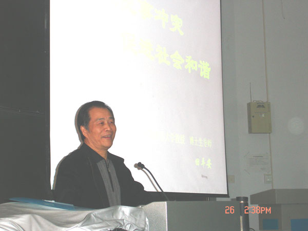 在这场报告中,田教授首先分析了和谐社会的价值底蕴和现阶段社会存在的不和谐现象,紧接着田教授从理论上解读了民事类不和谐现象(民事纠纷)产生的原因,列举了现行的平息民事纠纷的方式,并对现行各类民事纠纷的不足进行了剖析,最后从理论的高度上提出了对平息民事诉讼的手段完善。