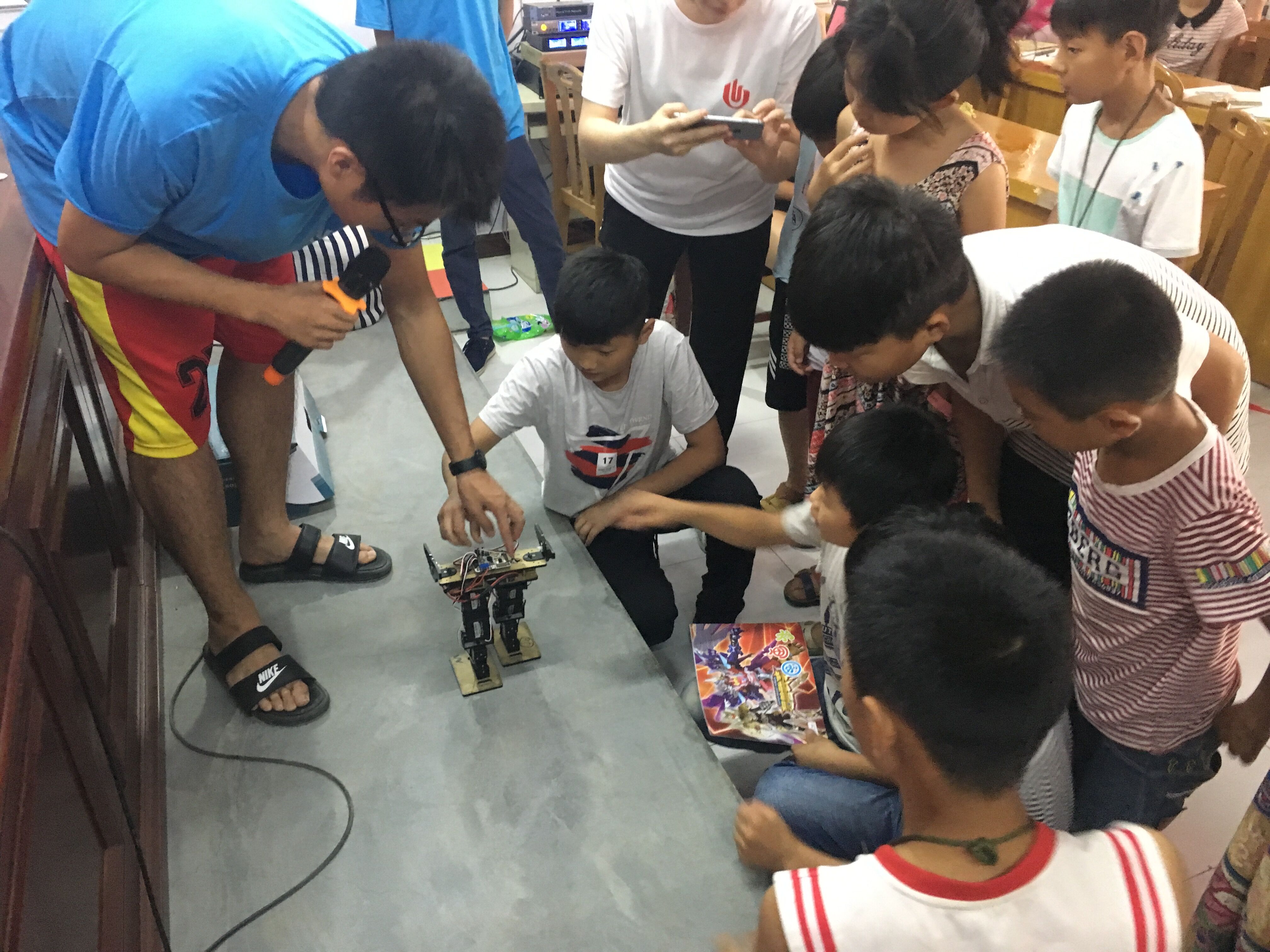 7月10日,小分队到达荥阳市聂楼社区。队员们把自己制作的无人机和智能机器人展示给前来观看的留守儿童,小朋友们对无人机和机器人展现出浓厚的兴趣与积极高昂的热情,并且向队员们提出有关无人机与智能机器人方面的很多问题,队员们针对这些问题为他们一一解答,并普及了相关知识。最后,小分队成员在社区文化中心集中给留守儿童阐述无人机与智能机器人的相关原理和所运用到的知识,在讲解过程中队员们与小朋友们进行了互动。最后小分队成员以及全校各个志愿者队伍与留守儿童进行了合照留念。