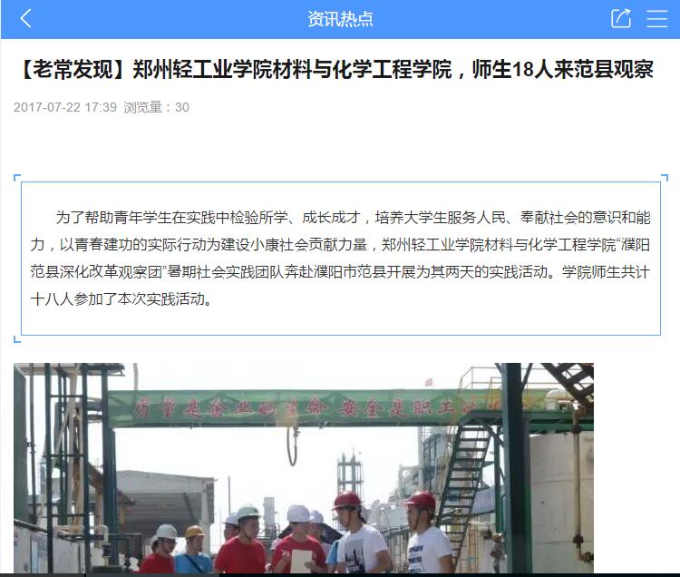 该团队已被资讯热点所报道(郑州轻工业学院材料与化学工程学院,师生18人来范县观察:http://zhfxtv.qingk.cn/information-info/zhfxtv/0f3cd7e464134e869ed936c56c43c27f/fbvoeocqfsuesdadwteatfbftddbrbot/bca671e89c9802b3b2ee3482126f6ce8/f1e9e679fe58446c8c4fa11f47760692?loc=out&from=singlemessage)
