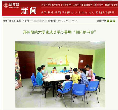 该服务队已被科学网报道(“郑州轻院大学生成功举办暑期‘朝阳读书会’”:http://news.sciencenet.cn/htmlnews/2017/7/382709.shtm)