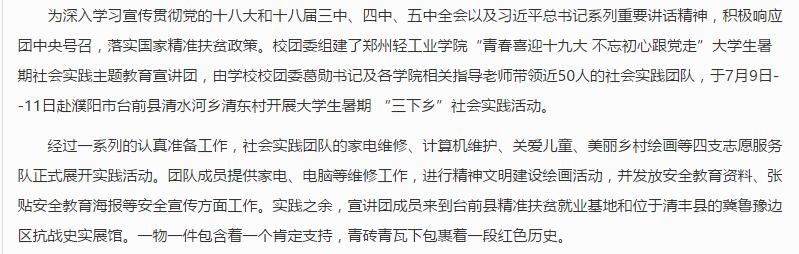 该两支服务队已被中国大学生网所报道(青春喜迎十九大不忘初心跟党走—记轻院教育宣讲团赴濮阳市宣讲:http://www.universitychina.net/shijian/news/20170719/13755.html)