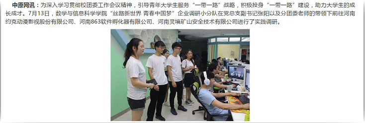 该服务队已被中原网所报道(郑州轻工业学院数学与信息科学学院“丝路新世界青春中国梦”社会实践小分队,引导青年大学生服务“一带一路”倡议,积极投身“一带一路”建设,助力大学生成长成才:http://m.zynews.cn/eyes/2017-07/21/content_11089483.htm?from=timeline)
