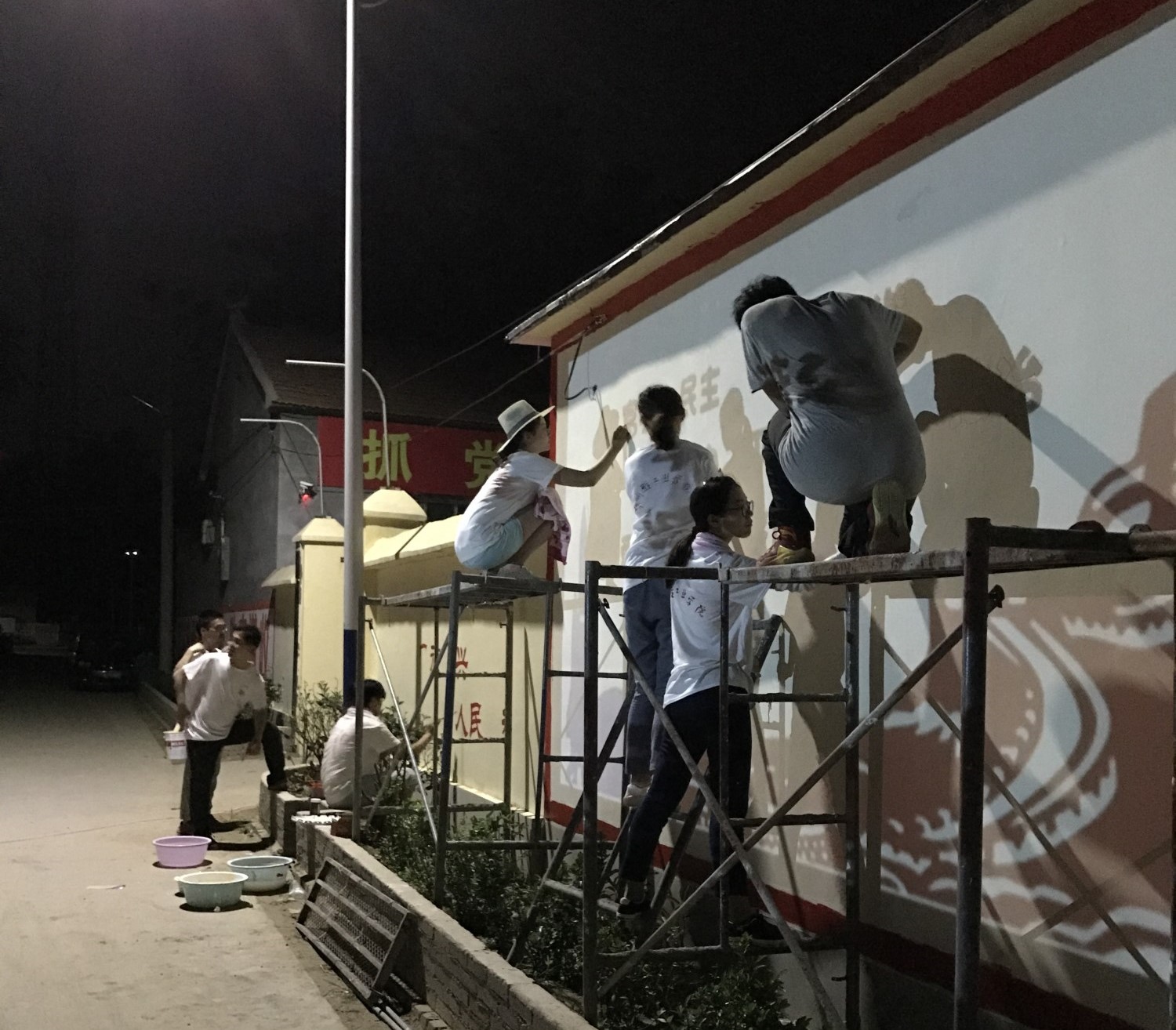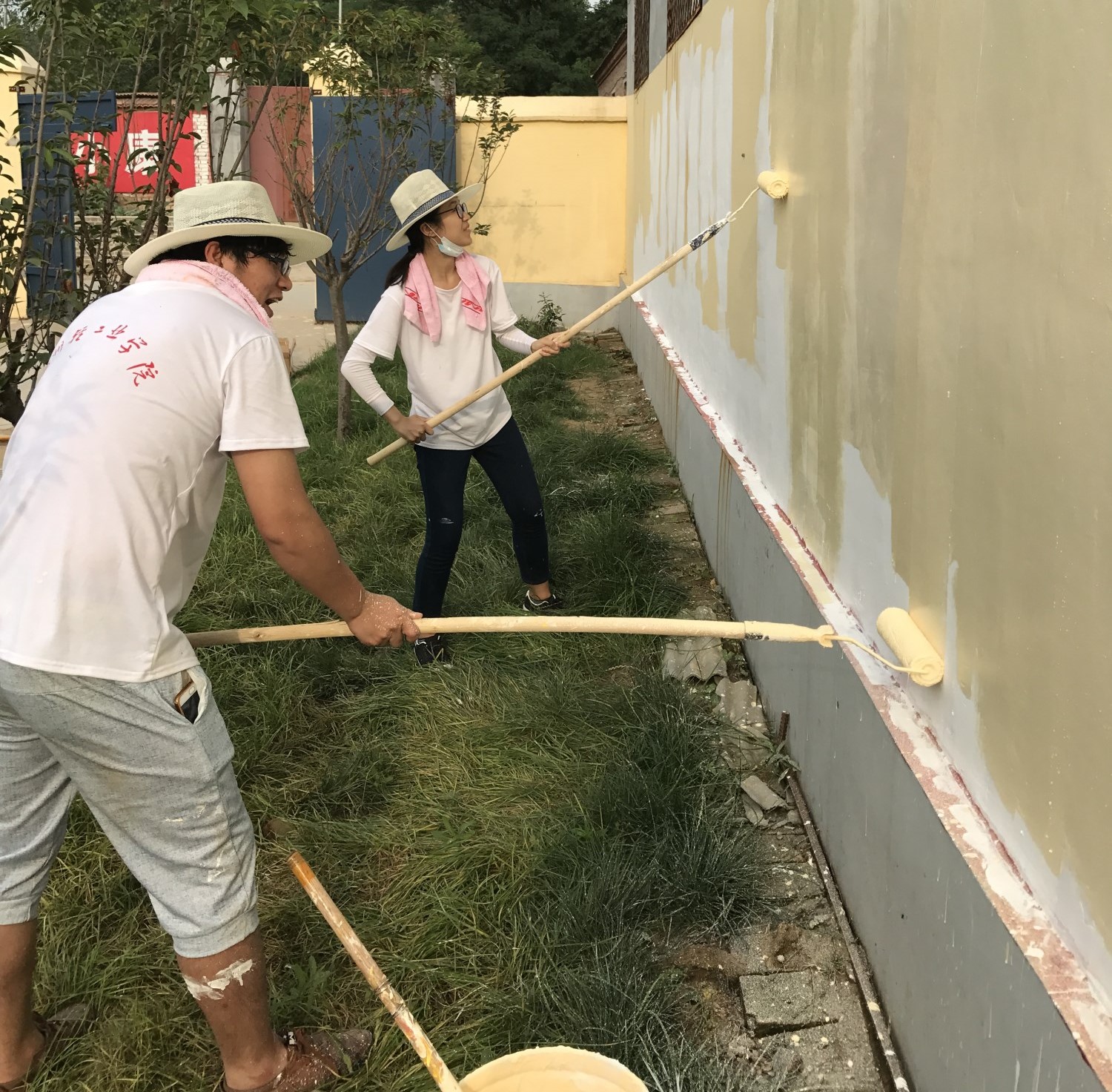 队员们在粉刷墙面