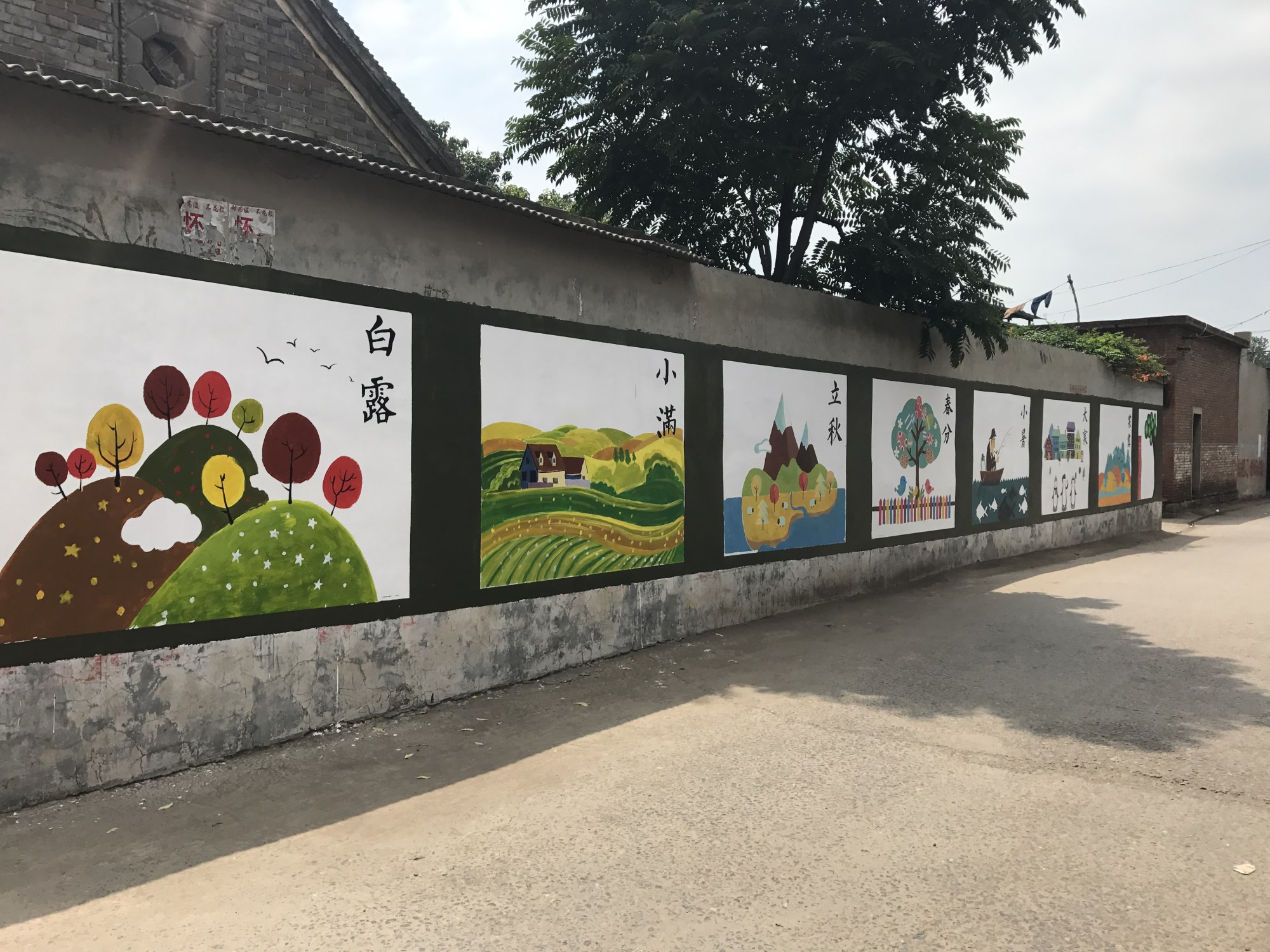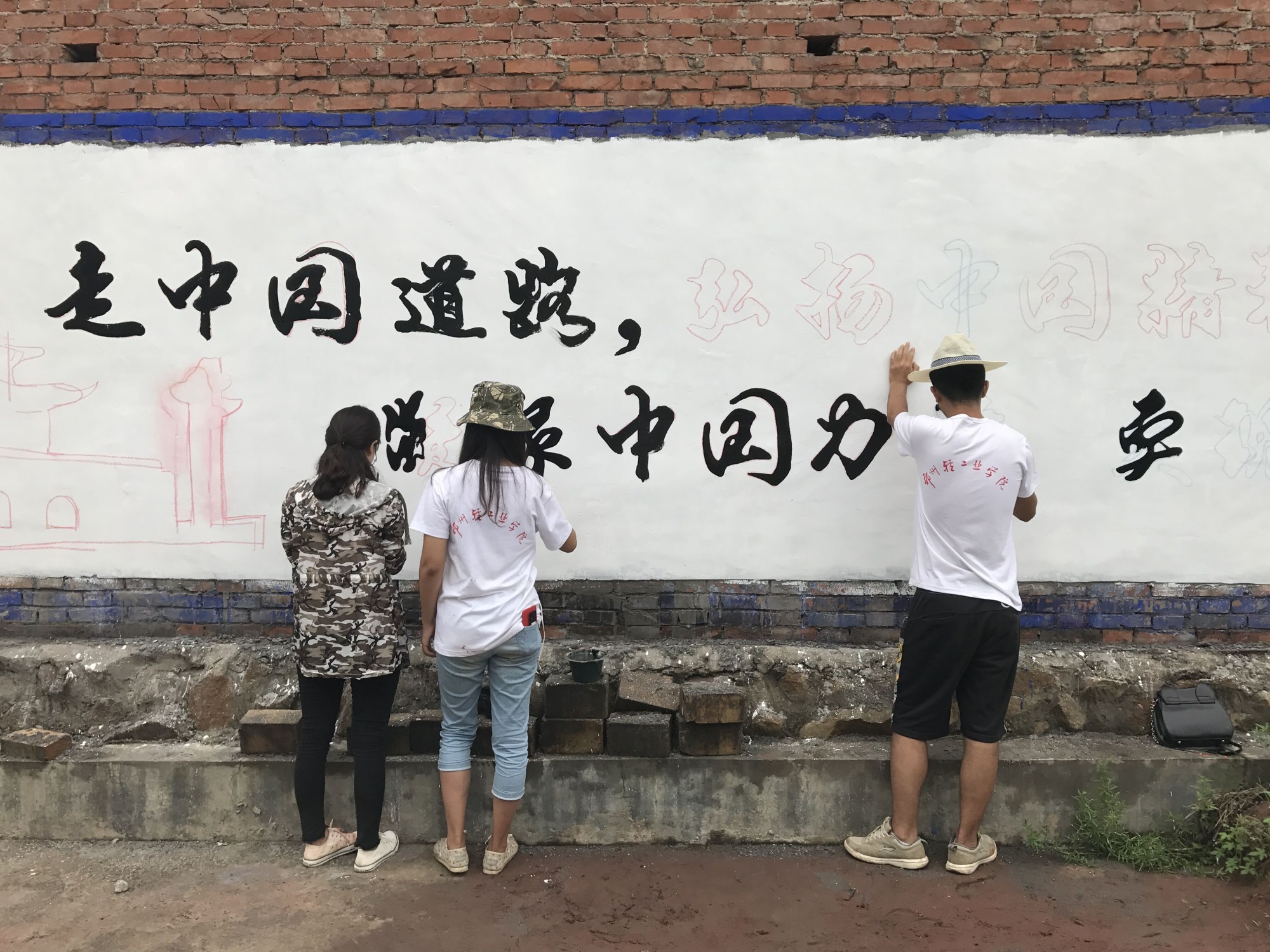 开展墙绘活动的几天,正值三伏天,酷热难耐。为了志愿者的安全起见,带队老师还特地制定了作息时间表。因村内墙面较多,设计方案不能一次性全部出来,队员们就边设计方案边推进其他墙面的绘画工作,工作进展得有条不紊。期间不断有热心的村民为队员们送来清凉的水果,让队员们深受感动,村民们的善良热情和对墙绘工作的支持鼓舞了队员们的士气。18日,几条主干道的墙面已经全部绘制完毕,阶段性效果已经显现,村容村貌焕然一新,村民们走在街上常常会驻足观看,连连称赞。