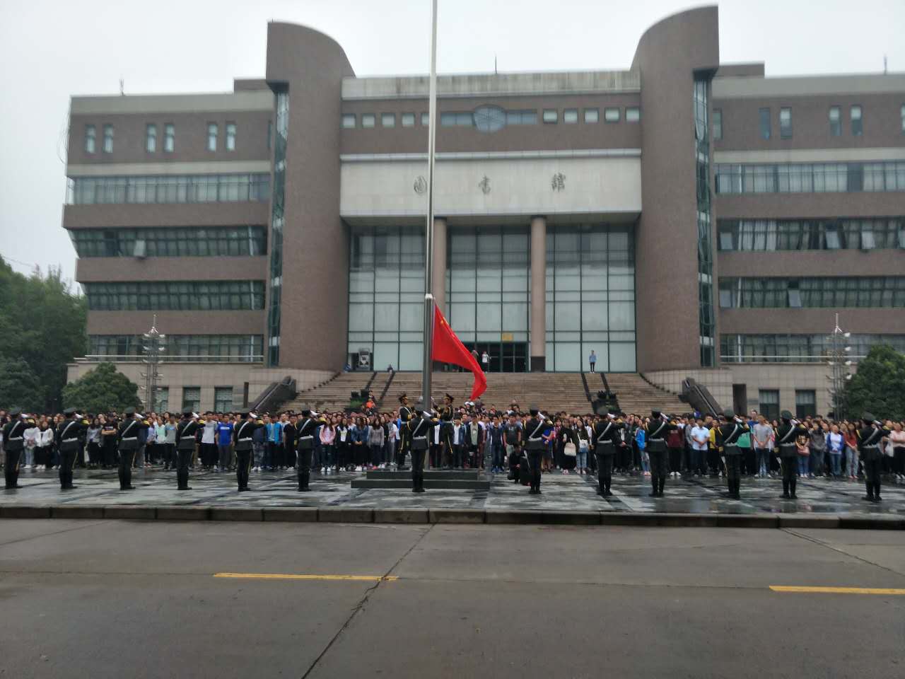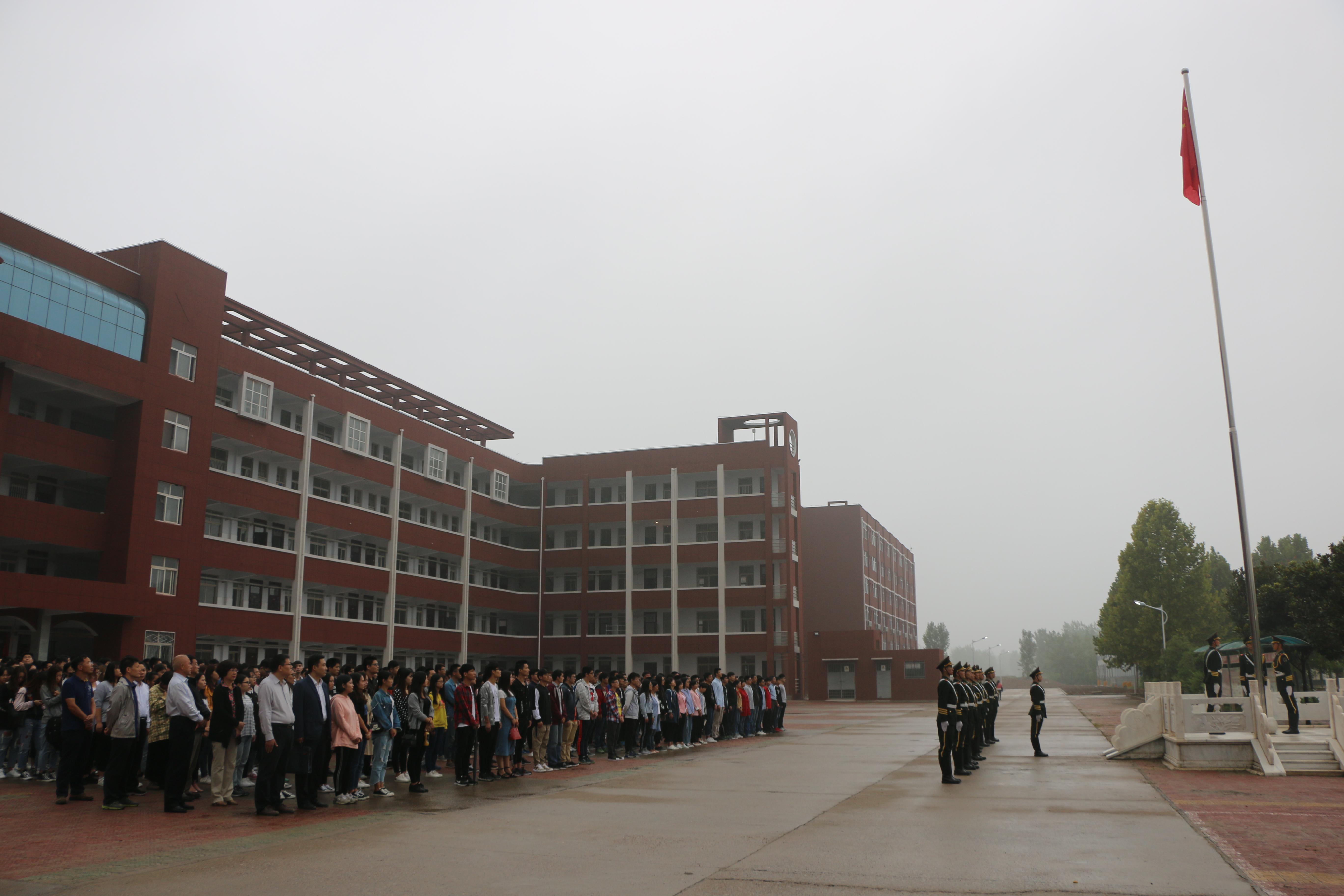 9月4日清晨,我校部分校领导、学校相关职能部门、教学单位的老师和4500余名学生冒着蒙蒙秋雨齐聚东风校区图书馆广场、科学校区主教楼广场和禹州校区第二实训楼广场,参加了新学期第一天的升国旗主题活动。