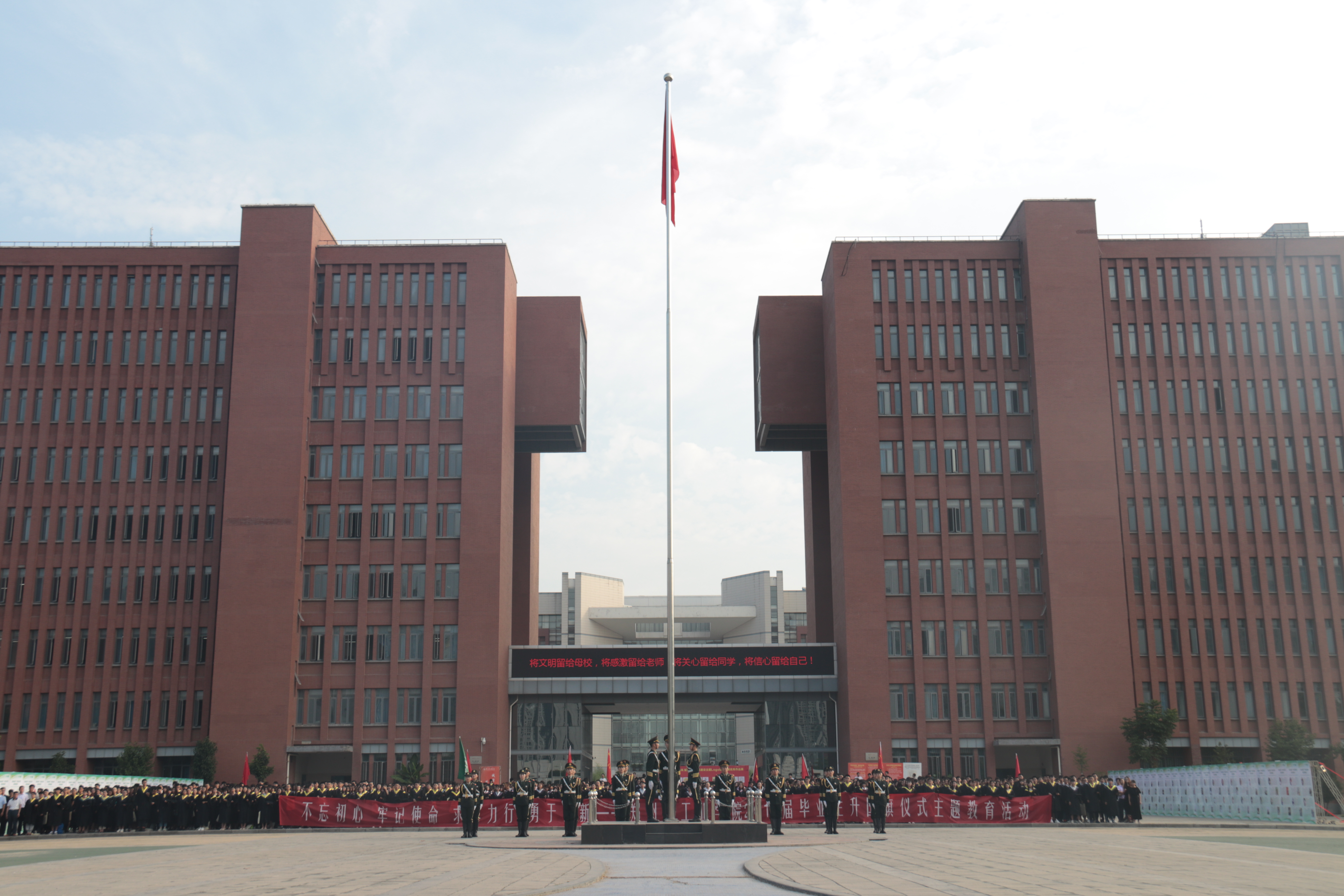 本次升国旗仪式是2018届毕业生文明离校一项重要活动,是对毕业生离校前的一次讲文明树新风、爱校荣校的教育活动。挥手自兹去,萧萧班马鸣,希望我校2018届毕业生们秉承“为之则易,不为则难”校训精神,勇于担当,用我们所学、所长,谱写更动听的乐章,用我们的努力与成功回报社会,再创辉煌。