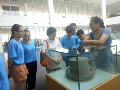 | 工作人员讲解三全创始人用的小石磨 | 参观生产线 |