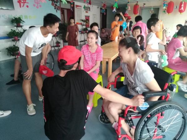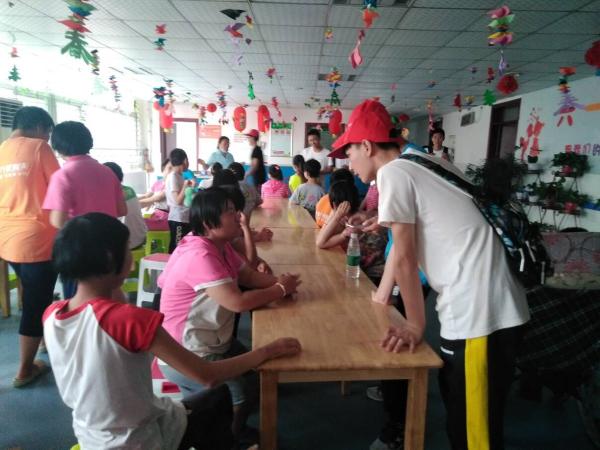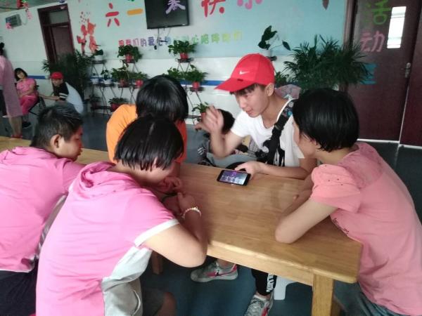 汇聚爱心,传递真情。成员们在一楼的儿童活动室与孩子们一起聊天、唱歌、玩游戏。在福利院,学龄前儿童由专业幼师带领进行活动,饮食起居也有专人照料。然而,完整的家庭对孩子的重要性是无可取代的,孩子与工作人员的人数差距也决定了这些孩子不能得到像在正常家庭里那样无微不至的照顾。队员们到来时,这些孩子往往呈现出自卑、敏感、自闭等心理状态,他们渴望被关注,渴望肢体上的接触,一个拥抱,甚至一次牵手,都会让他们感到非常开心。在休息室外,另几位成员正陪同两位残障少年聊天。在聊天后,两位原本内向偏激的孩子明显放轻松了自己的精神,状态也明显改善,回归了正常的思维模式,队员们的开导对他们起到了良好的指导作用。