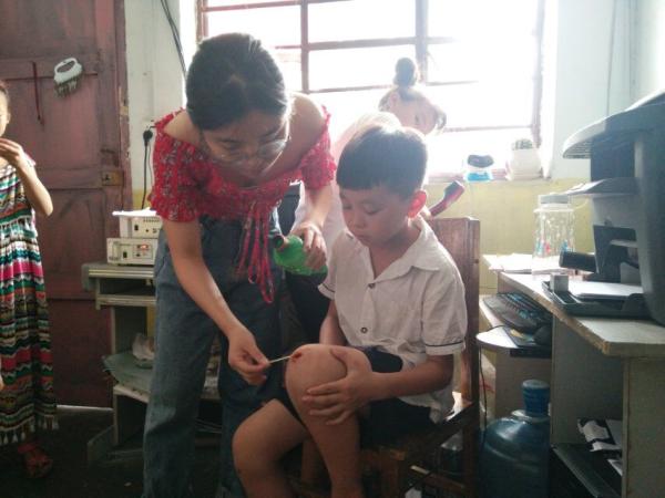 | 小分队成员给孩子们盛饭 | 小分队成员为受伤的小孩儿抹药 |