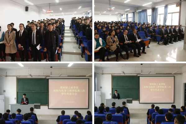 12月4日中午,郑州轻工业学院材料与化学工程学院第三次学生代表大会在化工楼218室隆重召开。学院党总支书记康国磊、校学生会副主席范文杰、分团委书记朱广正、辅导员王光霁、辅导员李瑞瑞及全体学生代表共计120余人参加了大会。