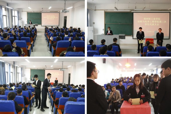 随后,各位代表分别审议并通过了《郑州轻工业学院材料与化学工程学院学生会工作报告》、《郑州轻工业学院材料与化学工程学院学生代表大会换届选举办法(草案)》,选举并产生新一届郑州轻工业学院材料与化学工程学院学生会主席团成员。