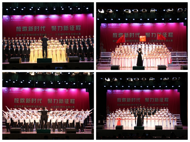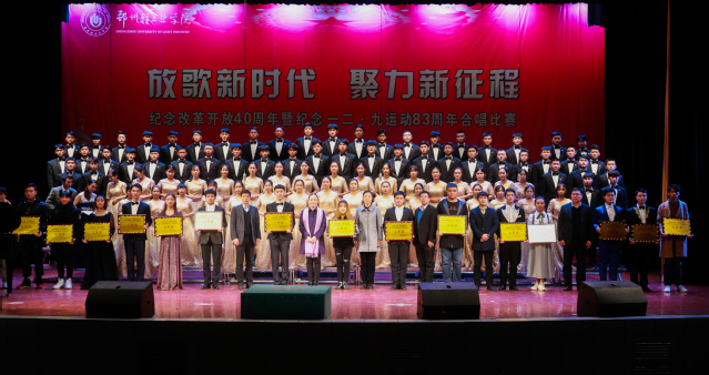 本次比赛计算机与通信工程学院作为开场首个参赛队伍,以《怒吼吧,黄河》和《光荣与梦想》拉开了比赛的序幕,合唱气势磅礴,跳跃且活泼的音乐像是黄河的奔流,像是对全世界劳动的人民发出的庄严宣告:“无论身处何地,祖国需要我们都能站起来战斗”。能源与动力工程学院的参赛歌曲《弹起我心爱的土琵琶》和《保卫黄河》将本次合唱比赛圆满拉下帷幕。整场演出高潮迭起,现场听众心潮澎湃,歌声、掌声经久不息,16支合唱队均以扎实的功底、整齐的服装、饱满的状态、蓬勃的朝气亮相舞台,《唱支山歌给党听》、《我爱你,中国》、《英雄赞歌》等一曲曲红色经典相继登场,唱出了青年学子对党、对祖国的深厚感情。《不忘初心》、《阳光路上》、《走向复兴》、《迎风飘扬的旗》等一首首脍炙人口歌曲讴歌了祖国迎着新时代的步伐,带领我们在复兴路上从胜利走向胜利的丰功伟绩。32首脍炙人口、风格各异的参赛歌曲气势磅礴、激情澎湃,参赛队伍引吭高歌,整齐有力、慷慨激昂,极富感染力,各学院的歌声或舒缓轻柔、以情动人,或高昂有力、振奋人心,用嘹亮的嗓音唱出了对未来美好生活的憧憬,热情讴歌我国改革开放40年取得的辉煌成就。经过激烈角逐,食品与生物工程学院、计算机与通信工程学院荣获一等奖;材料与化学工程学院、经济与管理学院、软件学院荣获二等奖;国际教育学院、建筑环境工程学院、能源与动力工程学院、机电工程学院、政法学院荣获三等奖;体育学院、艺术设计学院、数学与信息科学学院、电气信息工程学院、物理与电子信息工程学院、外国语学院荣获优秀奖。