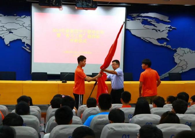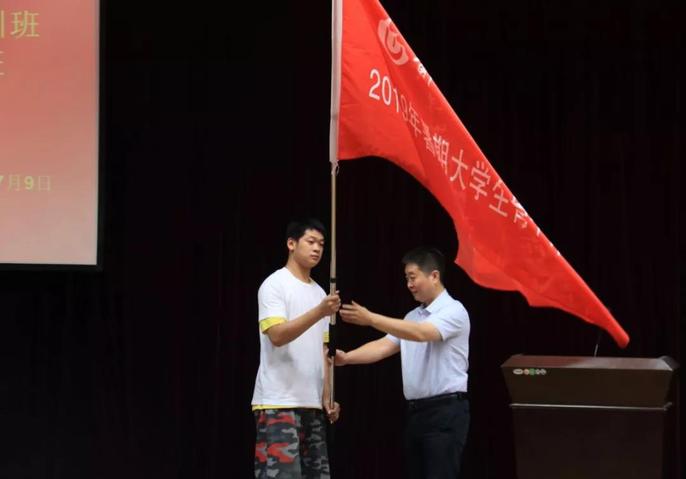 随后,培训班班委宣读学习期间纪律要求。活动最后,校团委书记葛勋老师、副书记王银峰老师分别为东风、科学两校区暑期团员干部培训班暨“青马工程”培养班授旗。