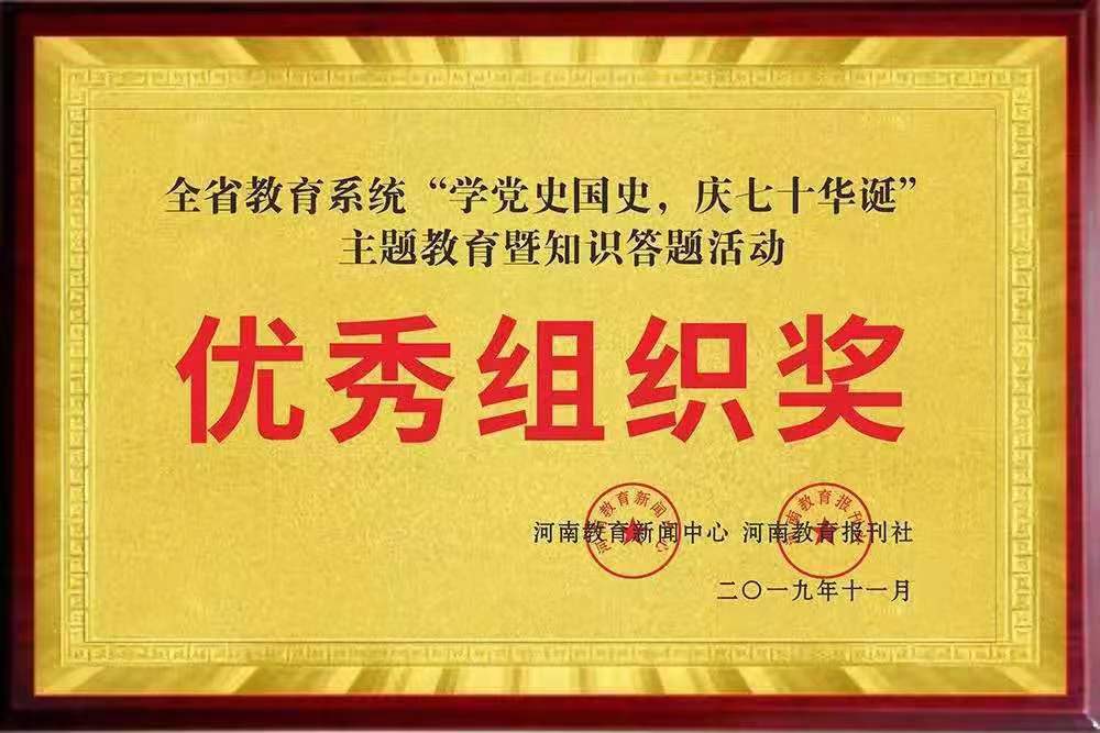 近日,由河南教育新闻中心、河南教育报刊社主办的全省教育系统“学党史国史,庆七十华诞”主题教育暨知识答题活动获奖已公布,我校张珂等6名学生荣获得一等奖,李卫卫等16名学生荣获二等奖,司冰蕾等19名学生荣获三等奖,学校荣获“优秀组织奖”(全省高校共10所)。