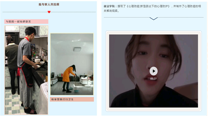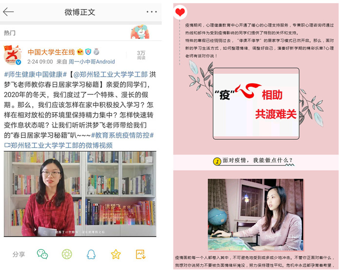 冬日严寒,唯有悉心关怀,方可使学生感到“暖心”。疫情以来,心理健康教育中心共发布“疫”心相助系列公众号推文9篇,各学院推送心理调适相关推文145篇,以多种形式为学生奉上了暖心的心灵鸡汤。其中,有心理老师们送出的心理寄语,为学生解答居家期间情绪调节、家庭关系处理、生活秩序安排等问题;有中心老师主播的微视频“春日居家学习秘籍”,用亲切活泼的方式与同学们面对面分享居家自我调整妙方(该视频被“中国大学生在线”微博转载)。