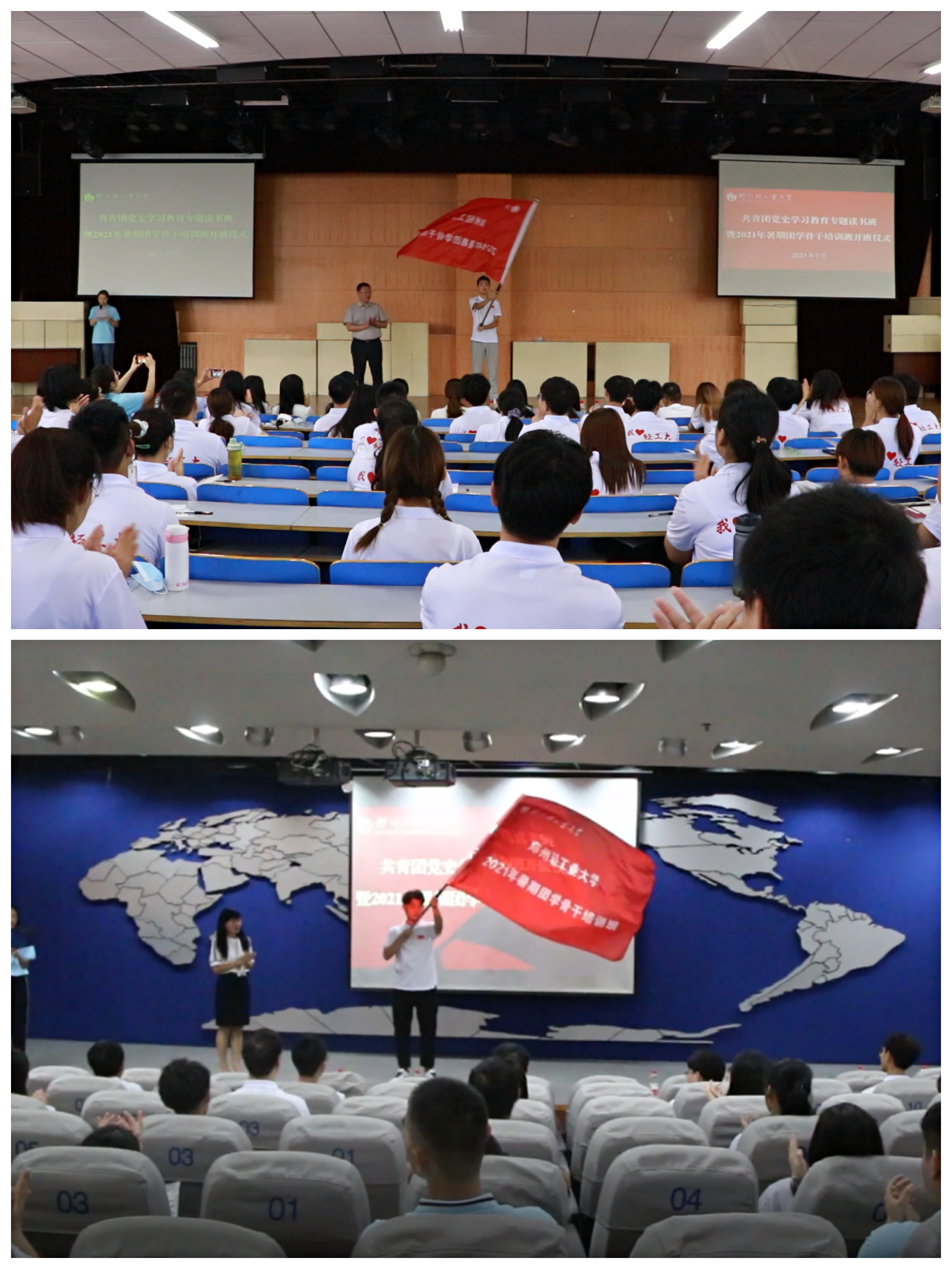 此次培训班是在学校共青团全面加强“学党史、强信念、跟党走”学习教育、提升共青团“三力一度”的背景下举办的学习培训活动,旨在加强团学骨干理论学习,感悟“真理之甘甜”,自觉“知行合一”为群众办实事。计算机与通信工程学院王航航、电气信息工程学院贾连斐作为两校区学员代表发言,他们号召大家珍惜学习机会,遵守培训纪律,把本次培训班的所学所感所悟更好地运用到服务同学、服务学校中。最后,本次培训班班主任为学校共青团党史学习教育专题读书班暨2021年暑期团学骨干培训班授旗。