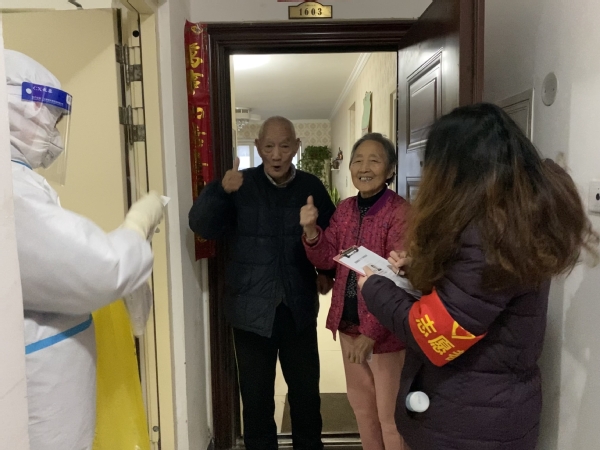 小区内有数十户高龄老人、孕妇、婴幼儿、残障人士等特殊困难群体,王静雅主动请缨,和工作人员一道为他们提供入户核酸检测的“上门服务”。这些群众人数虽不算多,但位置相对分散,工作难度较大。一对年过八旬的老夫妇看到王静雅他们穿着厚厚的防护服一栋楼一栋楼的逐一走访,不禁竖起了大拇指,激动地说道,“你们真中!”听到居民的肯定,王静雅更觉得自己的辛苦是值得的!