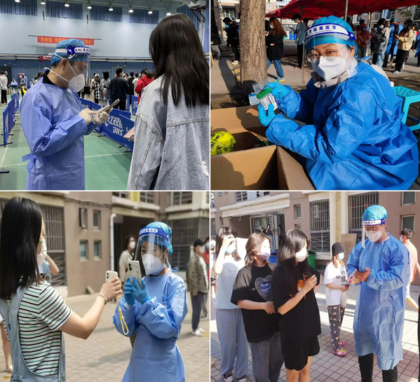 学院老师们穿着厚厚的防护服不论烈日寒风,在核酸检测现场为同学们扫码登记。