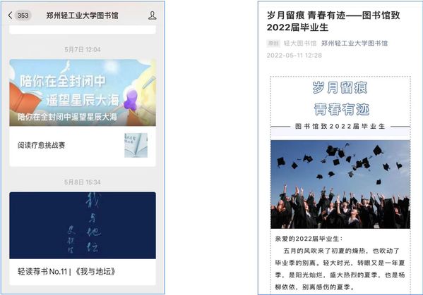 在阅读推广方面,主打推出了阅读疗愈系列活动,精选疗愈系推荐书目、阅读打卡活动等,让阅读从“校内循环”迈入了“社会循环”的新阶段;精心策划了两院院士、前沿专家主讲的“陪你在封闭中遥望星辰大海”系列讲座,让阅读积蓄起疗愈和成长的正能量。作为品牌项目,微信公众号“轻读”系列的读书、荐书、撷华、“音”为有你等线上阅读活动在全面展开。