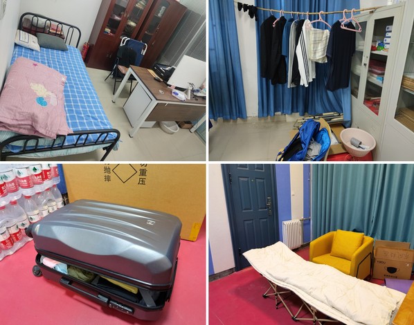部分教师校内没有住宿条件,有的住在学生宿舍的空床位、有的住在办公室、有的住在活动室,打地铺、睡沙发、躺折叠床,克服了许多生活上的困难,只为当好学生健康成长的守护者。
