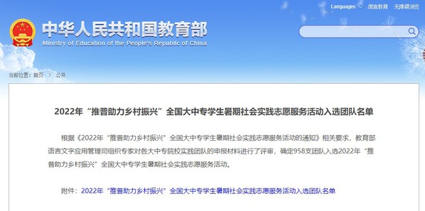 近日,教育部发布了《2022年“推普助力乡村振兴”全国大中专学生暑期社会实践志愿服务活动入选团队名单》,我校“豫见游子吟”教育关爱团成功入选。