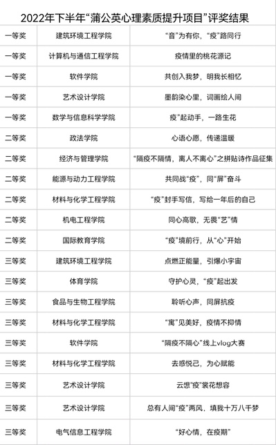 截至目前,2022年下半年获批立项的285个“蒲公英心理素质提升项目”顺利结项,共惠及学生1.1万人。项目围绕当前疫情形势的新局面,从学生日常的情绪管理及心理疏导入手,以各种类型的活动打开学生心扉。各级蒲公英使者在同学们封控于宿舍的有限条件下,创意出了各类线上活动,有效地缓解了特殊时期同学们的情绪压力,激发了青春活力,增进了人际支持。品牌特色类活动,如“‘音’为有你,‘疫’路同行”“墨韵染心里,词画绘人间”“‘隔疫不隔情,离人不离心’之拼贴诗作品征集”以音乐、诗词为载体,通过丰富多彩的活动浸润心灵、舒缓压力,增进人际交流,形成了独特的活动魅力;团队建设类活动,“疫情里的桃花源记”“共同战‘疫’,同‘屏’奋斗”“‘疫’境前行,从‘心’开始”“同心高歌,无畏‘艺’情”“点燃正能量,引爆小宇宙”等项目通过线上团体心理活动促进了同学间的交流与合作,增强了班级的凝聚力和向心力,共同营造了分享与互助的班级氛围;艺术表达类活动,如“共创入我梦,明我长相忆”“‘疫’起动手,一路生花”“云想‘疫’裳花想容”等通过角色扮演、创意短视频制作、手工制作等多种形式帮助参与者在艺术体验中表达情绪,挖掘心理潜能,展现了当代大学生的自信与活力;心灵成长类活动,如“心语心愿,传递温暖”“‘疫’封手写信,写为一年后的自己”“‘隔疫不隔心’线上vlog大赛”“去惑悦己,为心赋能”等引导参与者认真感悟生活,用心发现美好,彼此传递温暖,以积极的心态面对当下。