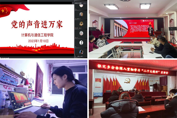 计算机与通信工程学院、政法学院和外国语学院利用寒假学生返乡时机组成理论普及小分队在福建省翔安区、山东省壮岗镇、河北省虹桥镇、天津市南开区、河南省张完乡等地开展党的二十大精神进社区、进乡村、进企业宣传活动。同学们重点围绕党的二十大提出的全面推进乡村振兴、坚持教育优先发展、实现全体人民共同富裕等贴近群众生产生活实际的政策进行详细阐述,用通俗易懂、简明直白的话语传递党的声音,用实际行动助力打通基层宣讲的“最后一公里”,让党的二十大精神“飞入寻常百姓家”。
