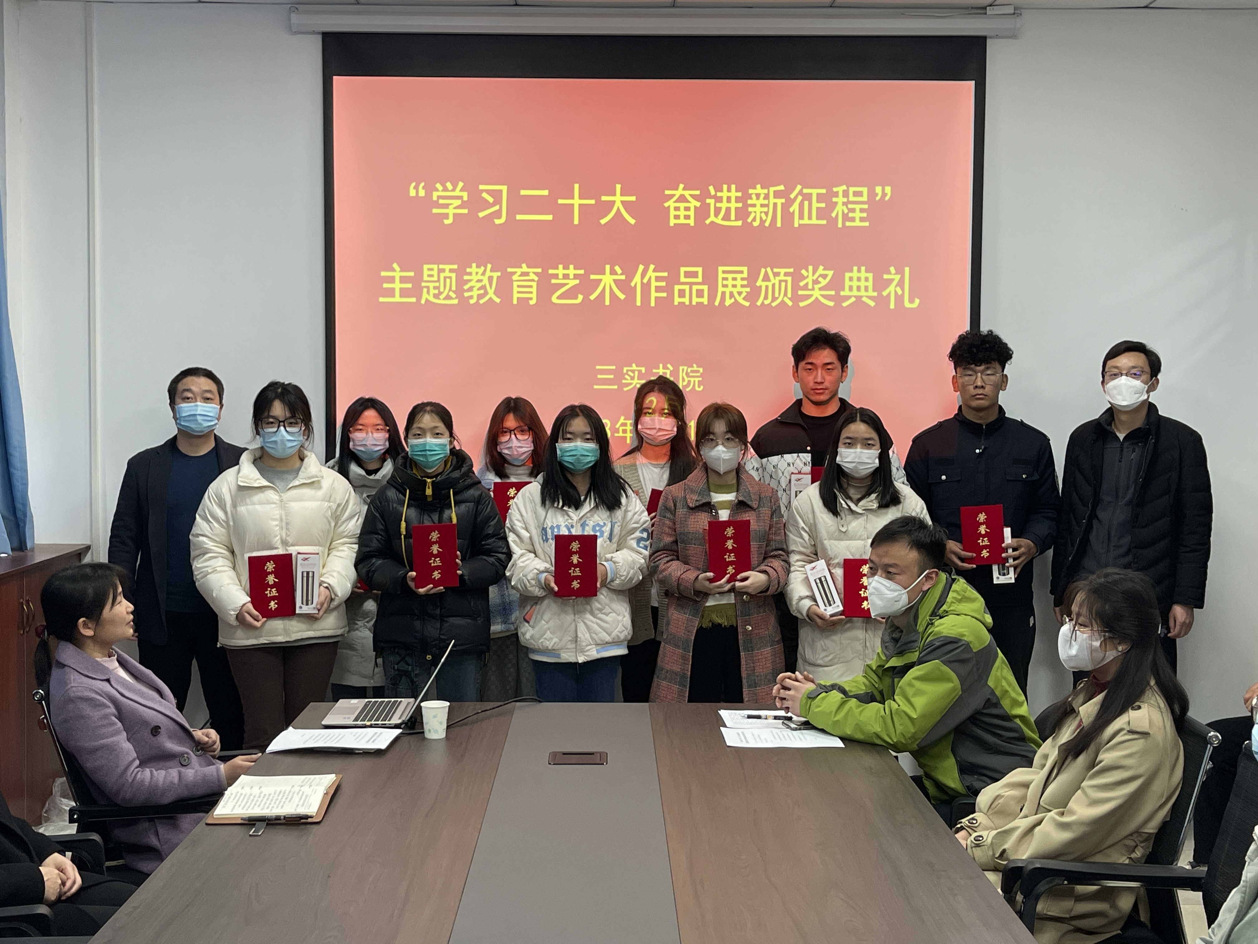 本次主题教育作品征集活动紧紧围绕“学习二十大 奋进新征程”主题,共征集学生作品百余件,形式包含绘画、书法、摄像等,同学们怀抱对党的崇高敬意,回顾党的百年历程,将对党的二十大精神的理解融入作品中。作品充分展现了三实书院学生与党同行、与祖国同行、与时代同行、与梦想同行的价值追求,体现了学生们对党和祖国的热爱之情。经过严格评选,汪祯祯等五位同学荣获一等奖,方钰等十位同学荣获二等奖,付成龙等十五位同学荣获三等奖。书院老师分别为获奖学生颁发奖状、奖品并合影留念。