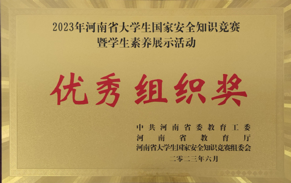 近日,由省委教育工委、省教育厅主办的2023年全省大学生国家安全知识竞赛暨学生素养展示活动现场决赛在郑州举行,省教育厅二级巡视员、副总督学黄才华等出席决赛现场。经前期选拔的全省20支高校参赛队伍参加现场决赛。经过激烈角逐和综合评分,我校代表队获得决赛优秀奖,学校荣获“优秀组织奖”,我校已连续四年获此殊荣。