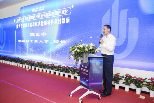 研究院首席科学家、中国科学院院士、重大专项项目负责人朱美芳、河南省科技厅党组成员、副厅长陶曼晞、河南省科技厅资源环境与社会事业科技处处长贺继伟、副处长王婷、郑州市科技局二级调研员任灿、郑州高新区党工委副书记王德敏、郑州高新产业投资集团总经理陈金阁及我校校长魏世忠、副校长张骁出席了本次活动。河南省科技厅、郑州市科技局、郑州高新区管委会梧桐园区运营中心的同志,项目牵头单位轻大产业技术研究院与合作单位河南金丹乳酸科技股份有限公司、东华大学、中原工学院、河南驼人贝斯特医疗器械有限公司、河南科高辐射化工科技有限公司的负责同志等参加活动。