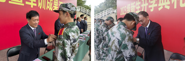 党委副书记杨新宇宣读军训先进连队的表彰决定。大会对新生军训中涌现出的先进连队进行了表彰,出席大会的校领导和承训部队首长向先进连队代表和个人颁发了奖牌。校领导为2023级新生代表佩戴了校徽。