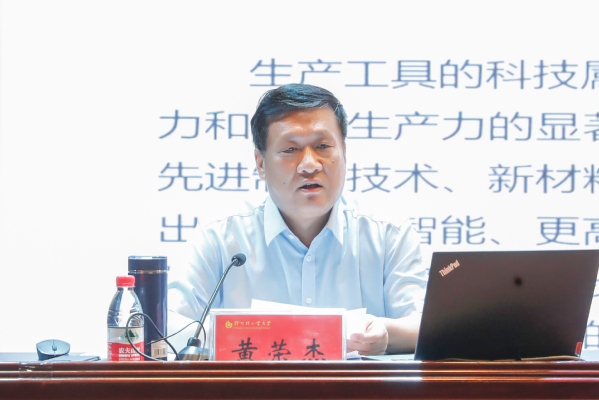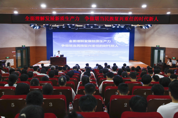 黄荣杰用“热度高涨的新质生产力究竟是个什么力?为什么现在要强调发展新质生产力?该如何发展,如何布局?高校要如何发力?青年一代又该如何挺膺担当?”等一连串启发性提问,展开了精彩的讲座。他从新质生产力的基本内涵、主要特征、核心标志三个维度,详细解读了习近平总书记关于新质生产力的重要论述,通过大量鲜活案例深度阐释了发展新质生产力的重大意义和实践路径。结合学校实际,从开展科研攻关、加强学科建设、优化产业结构、完善人才培养模式等方面介绍了我校服务国家区域发展战略,为新质生产力发展赋能助力的系列举措、取得的重要成果和下一步谋划部署。最后,他引用习近平总书记今年五四对新时代青年的寄语,勉励广大青年学生勇担使命、以奋斗筑牢底色,直面挑战、矢志不移自主创新,勤学苦练、练就过硬素质本领,争做有理想、敢担当、能吃苦、肯奋斗的新时代好青年,在推进强国建设、民族复兴伟业中展现青春作为、彰显青春风采、贡献青春力量,奋力书写为中国式现代化挺膺担当的青春篇章。