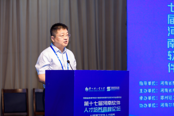 闫治国在致辞中指出全球科技革命加速推进中,机遇与挑战并存,河南省委、省政府高度重视软件产业发展,高校应聚焦新型平台软件、工业软件、行业应用软件、嵌入式软件等布局需求,努力培养满足河南软件产业发展各层次、各类型的特色化软件人才。
