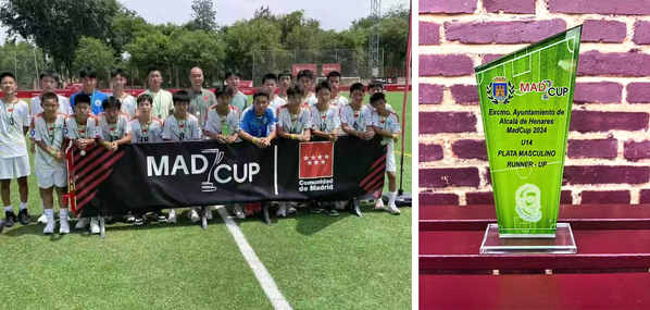 “MADCUP马德里杯”是由西班牙马德里竞技学院、马德里自治区政府和马德里皇家足球联合会2021年联合创办的全世界青少年足球赛事。本届赛事有来自35个国家和地区的809支球队参加各年龄段的比赛,附属学校足球队受邀参加U14的角逐。比赛期间,皇马、马竞等西甲豪门的青训总监都亲临现场观摩,从中物色有潜质的好苗子。U14比赛单场赛时缩短、赛程密集,每支球队都面临一天多赛的情况,极大的挑战着运动员的体能、意志和教练员的战术指导。为期十天的比赛中,附属学校足球小将们在小组赛中表现出色,成功晋级32强,在淘汰赛中,先后战胜了墨西哥IFA、西班牙特里瓦尔、西班牙BAX足球学校、西班牙波苏埃洛队,一路过关斩将冲入决赛。与西班牙NextStars足球学院队决赛中,常规比赛时间双发打平,最后点球大战1:3惜败对手,最终获得白银组亚军。比赛场上队员们精妙配合、激烈拼抢、大力射门,向其他国家和地区球队及现场观众展现了中国青少年敢于拼搏、敢于胜利的精神面貌。