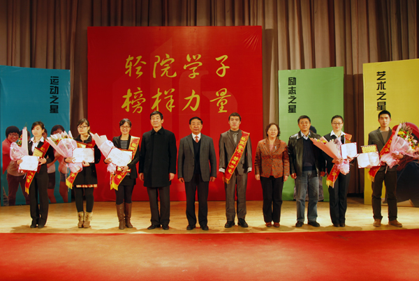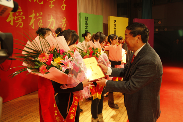 出席活动的校领导为先进事迹报告团成员颁发奖牌和证书