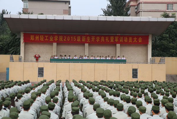 9月9日上午,郑州轻工业学院2015级新生开学典礼暨军训动员大会分别在东风校区和科学校区隆重举行。校领导石恒真、赵卫东、张胜利、窦效民、尚宝平、龚毅、陈江风、吕彦力、安士伟、毛多斌、王新杰、李世瑛,承训部队首长出席并在主席台前排就座。各院(系、部)和相关职能部门负责同志、承训部队教官和2015级新同学参加了典礼暨动员大会。大会由副校长安士伟主持。